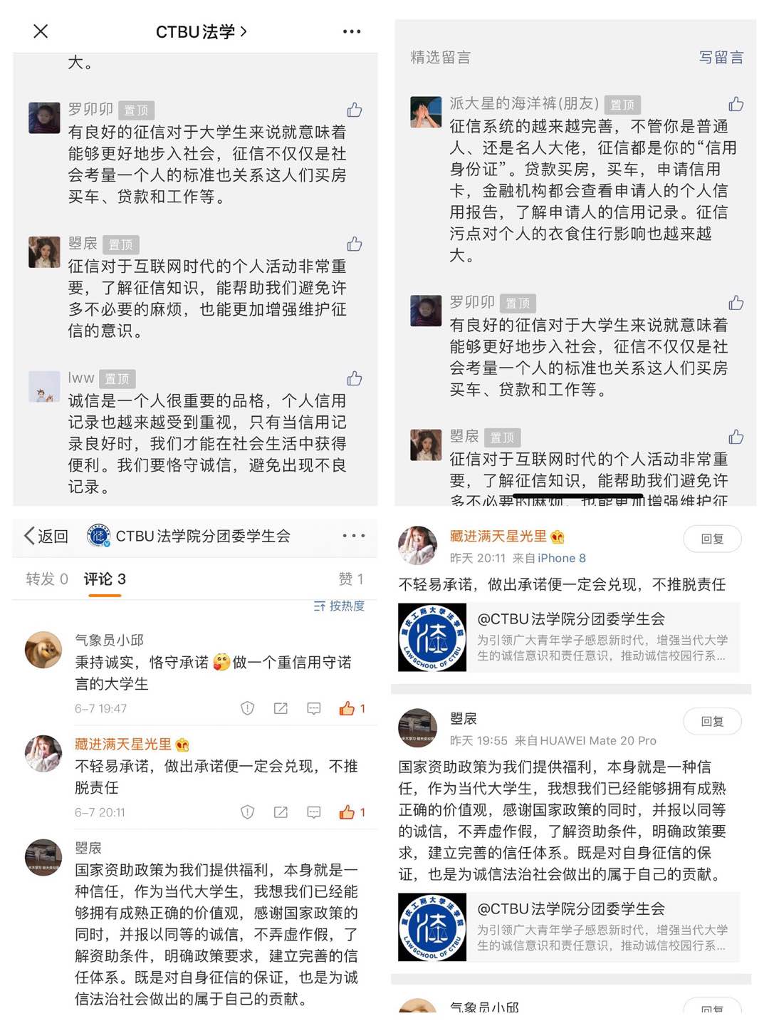 通过大力推进诚信教育,金融知识普及教育,在法学院学生中掀起了关于借贷诚信、考试诚信、做人诚信的舆论氛围,各班学生积极转发学习相关征信知识、金融知识、风险知识和法律知识,并在线上展开了热烈讨论。