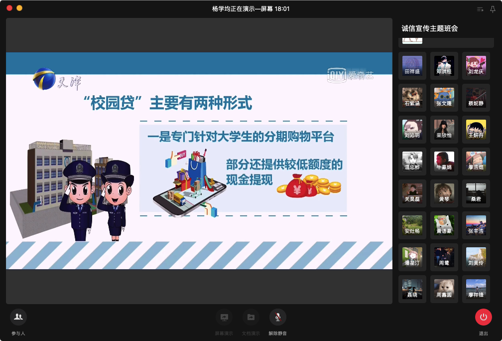6月1日上午,2018级法学二班通过企业微信开展了以学生资助诚信教育为主题的线上活动。同学们纷纷表示此次活动向大家普及了金融知识,引导大家珍爱信用,理性借贷,不负信任,提高了大家的征信意识、金融知识、风险意识和法律意识。