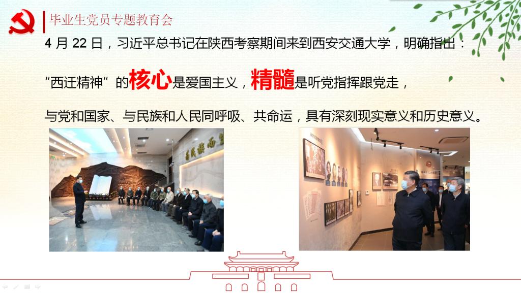 5月28日,会计学院学生第二党支部对毕业生党员进行离校前党性教育,支部全体党员参加。本次党课共有三部分内容组成。首先,支部书记付海南带领大家共同学习“西迁精神”,向全体党员介绍了“西迁精神”的历史背景、“西迁精神”的核心与精髓,观看了习近平总书记到西安交通大学调研时的相关视频。