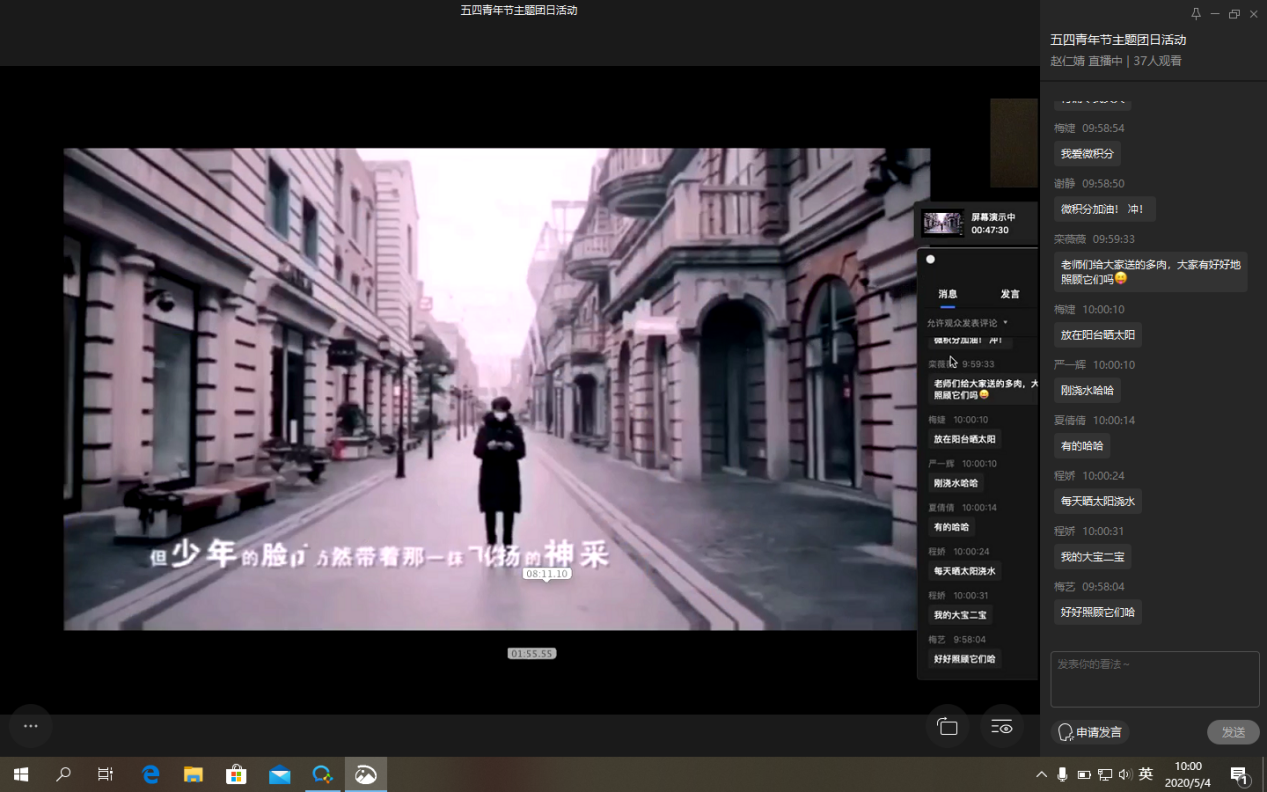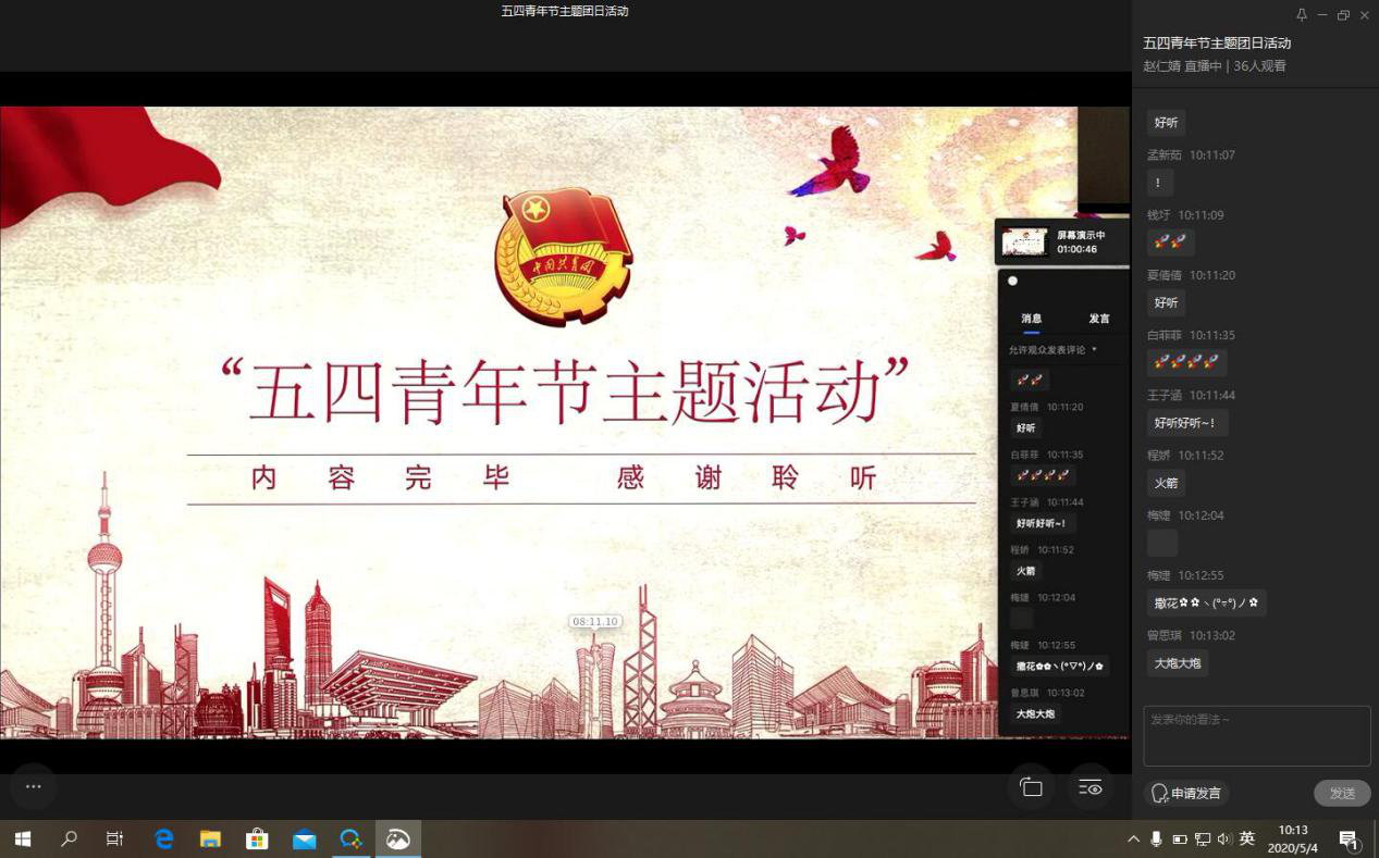 本次主题团日活动以企业微信直播形式进行,首先由担任主持人的临时团支部团支书赵仁婧带领支部团员们一起合唱团歌,随后观看广大青年投身疫情防控一线的视频,展现了当代青年投身抗疫工作取得的骄傲战果。同学们纷纷表示“为生命逆行骄傲,向凯旋英雄致敬”。紧接着通过学生代表分享、知识竞赛、朗诵等环节,团员们进一步了解了青年在疫情期间的责任与担当,理解了习近平总书记对广大青年“坚定理想信念站稳人民立场,练就过硬本领投身强国伟业”深切寄语、殷切嘱托的深刻涵义。随后,程娇同学结合习近平总书记五四讲话精神,给大家分享了自己在健康管理期间学习生活方面的规划,鼓励大家自觉安排学习任务,严于律己,进一步引导同学们在健康管理期间以积极心态面对学习生活,以更高标准要求自己,争做有时代担当的“后浪”。