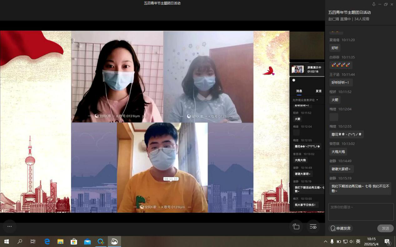 为充分发扬“党有号召,团有行动”的优良传统,加强团组织的思想引领作用,发挥团员的先进性和主动性,让首批返校的47名同学更有归属感和凝聚力,通识学院组建了湖北返校学生临时团支部,组织返校同学积极开展自我服务、自我管理,鼓励他们在特殊时期坚定信心、不惧困难、勇担责任。5月4日上午,已返校学生临时团支部开展了主题为“绽放战疫青春,坚定制度自信”的五四青年节线上主题团日活动。