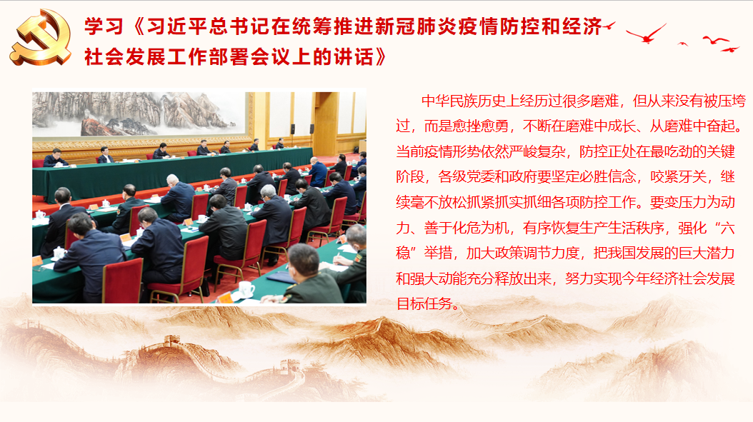 随后,支部党员热议《习近平总书记在统筹推进新冠肺炎疫情防控和经济社会发展工作部署会议上的讲话》的重要精神。