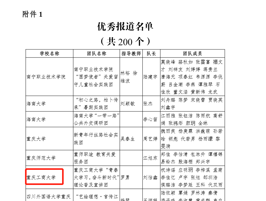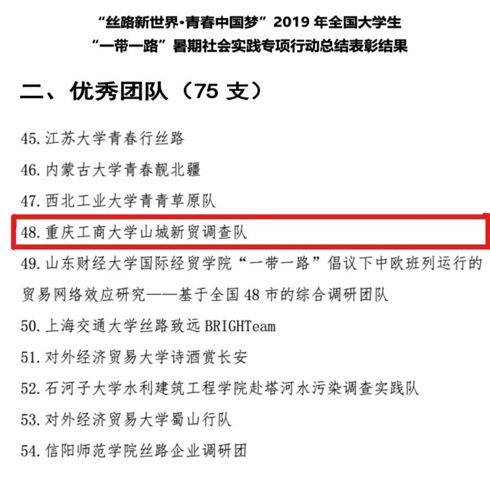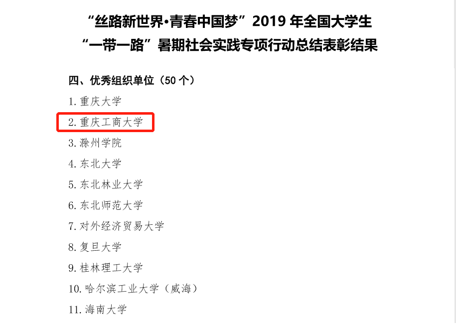 学校在全国大学生“一带一路”专项行动中获评优秀组织单位(全国50个);山城新贸调查队(管理学院BIM学生社团)获全国大学生“一带一路”专项行动优秀团队(全国75支);“工程新丝路”历史成就观察团(管理学院)获评全国三下乡社会实践优秀团队;“青春大学习•奋斗新时代”理论普及宣讲团(财政金融学院)获评团中央“镜头中的三下乡”优秀报道奖。