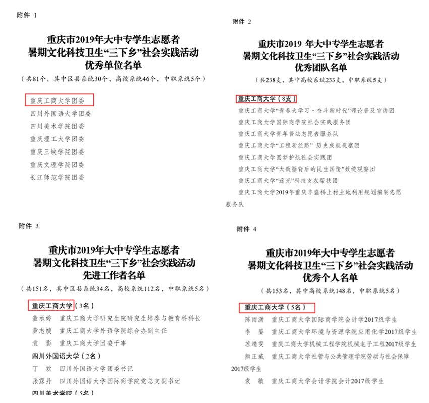 同时 ,我校获评重庆市“三下乡”社会实践活动优秀单位;圆梦护航社会实践团(经济学院)、“青春大学习•奋斗新时代”理论普及宣讲团(财经金融学院)、青年普法志愿者服务队(法学院)、“工程新丝路”历史成就观察团(管理学院)、“大数据背后的民生国情”数统观察团(数学与统计学院)、“逐光”科技支农帮扶团(文学与新闻学院)、重庆丰盛桥上村土地利用规划编制志愿服务队(旅游与国土资源学院)、米兰网站社会实践服务团(国际商学院)等8支团队获评市级优秀团队;董承婷(研究生院)、黄志婕(外语学院)、袁影(团委)3位老师获评市级先进工作者;陈雨潇(国际商学院)、李晏(环境与资源学院)、苏靖雯(机械工程学院)、熊正威(社管与公共管理学院)、袁敏(会计学院)5位同学获评市级先进个人。