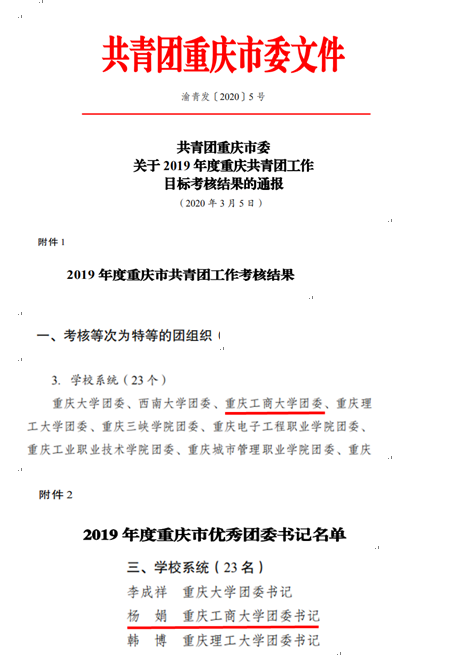 2020年3月5日,共青团重庆市委下发了《关于2019年度共青团工作目标考核结果的通报》(渝青发〔2020〕5号),我校在2019年度重庆市共青团工作目标考核中荣获特等奖。杨娟同志被评为“2019年度重庆市优秀团委书记”。