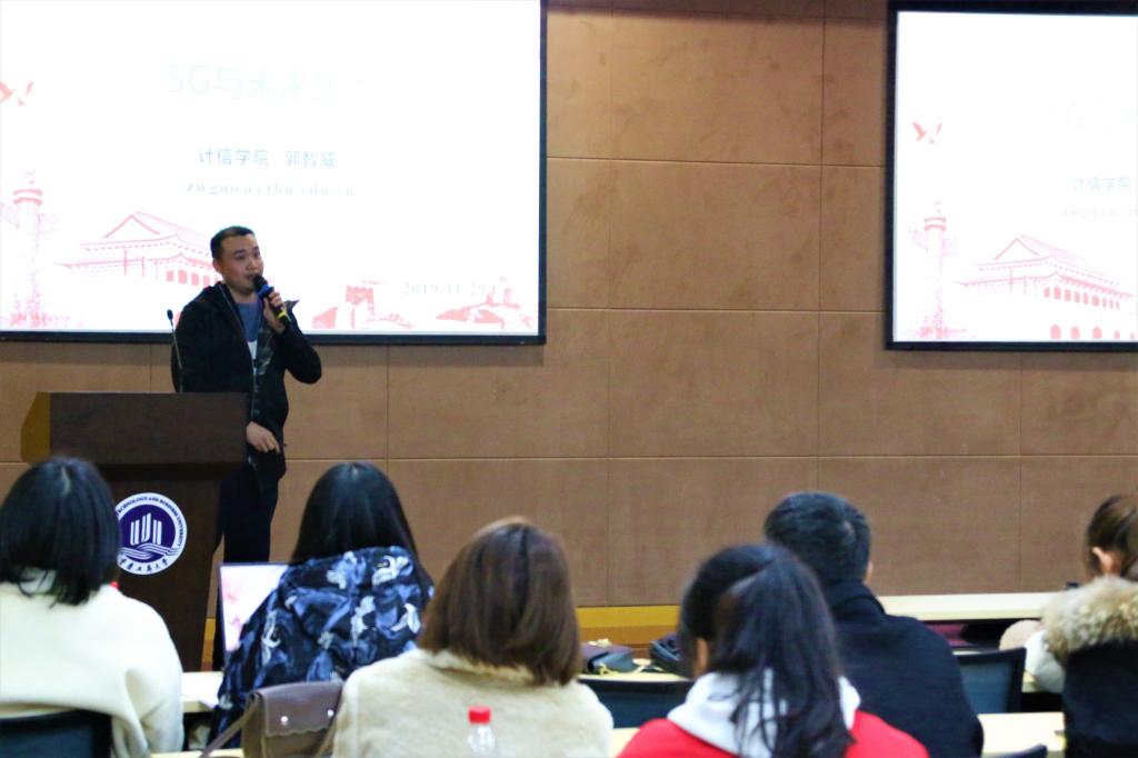 活动伊始,同学们通过观看短视频了解到5G时代的产生以及对我们生活的影响。随后,郭智威博士讲解了从1G到5G时代的由来,以及现在我国的5G技术已走到世界前列。郭博士的精彩演讲让同学们深深的认识到5G时代的重要性。龙跃教授则通过分析当今时代的趋势,鼓励大学生积极地抓住机遇,敢于追随5G的脉搏,他以自己的带队经历为例,阐述现在面对创新创业困难应该如何面对、解决。何林欣同学则通过自身的创业经历讲述了不管是参加比赛还是出去创业,核心团队不能丢。在互动环节,同学们积极回答问题,分享自己对于目前科学水平的发展进程的理解,现场氛围活跃。