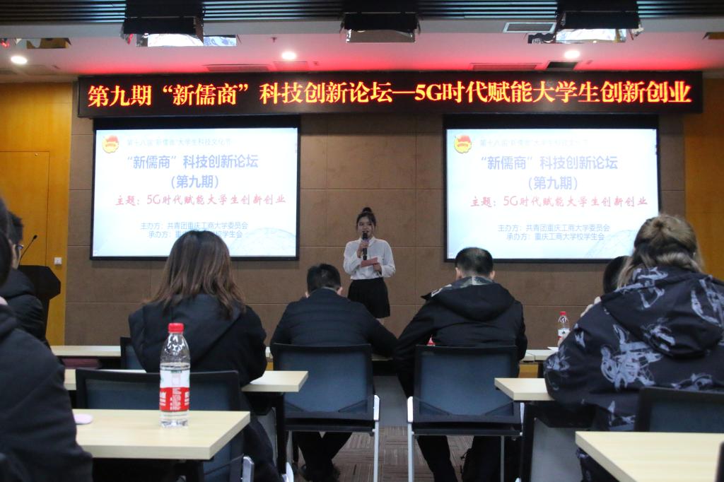 为加强我校学生对5G时代的理解,为创新创业提供更好的基础,实现科教兴国,11月29日下午,由校团委主办的第九期“新儒商”科技创新论坛在南岸校区图书馆二楼多功能厅举行。本次论坛以“5G时代赋能大学生创新创业”为主题,校团委书记杨娟,商务策划学院龙跃教授,计算机科学与信息工程学院郭智威博士,何林欣同学和100多名各学院的学生代表参加活动。