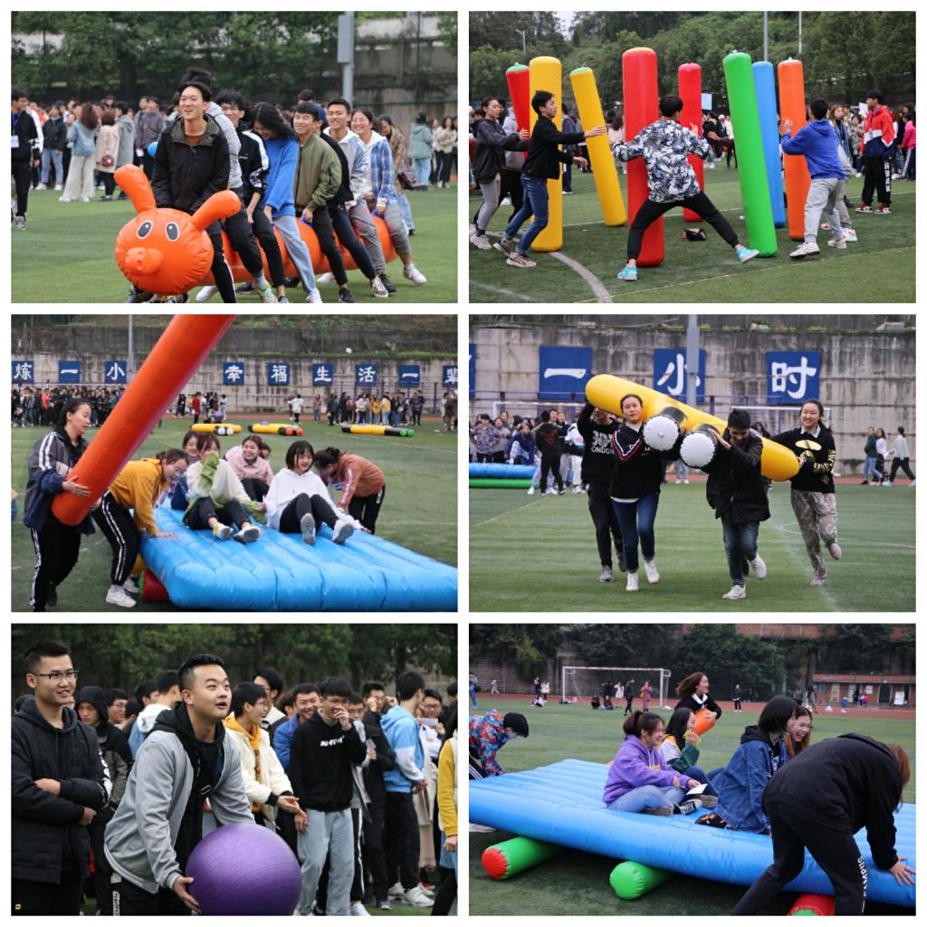 本次趣味运动会包括趣味投篮、龟兔赛跑、不倒森林、车轮滚滚、十拿九稳五个项目,趣味性十足。比赛现场,每一位同学都拼尽全力,努力为所在小组争得荣誉。“团结”一词在比赛中体现的淋漓尽致,各参赛选手充分发扬团结合作精神,在各个项目中拼尽全力,勇争第一,使运动会既充满趣味,又充满挑战。赛场上不断飘荡着同学们的欢声笑语,运动会精彩纷呈。在运动会如火如荼进行的同时,吉祥物“团团”也为运动员加油助威,深受同学们的欢迎与喜爱。