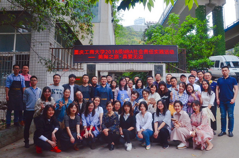 在美陶制作开始之前举行了简单的捐赠仪式,MBA学员班长刘太平代表全体学员向康复基地进行了捐赠,班长陈诗接受了康复基地回赠的纪念作品《轻轨穿楼》(第一件轻轨主题陶艺作品),基地黄建平主任出席捐赠仪式。