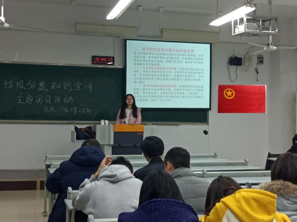 为积极响应《重庆市人民政府办公厅关于印发重庆市生活垃圾分类制度实施方案的通知》(渝府办发[2017]166号)相关文件精神,提高全校同学环保意识,建设美丽重工商大,旅游与国土资源学院各团支部在校团委号召下,分团委的组织下陆续开展“生活垃圾强制分类宣传教育”主题团日活动。