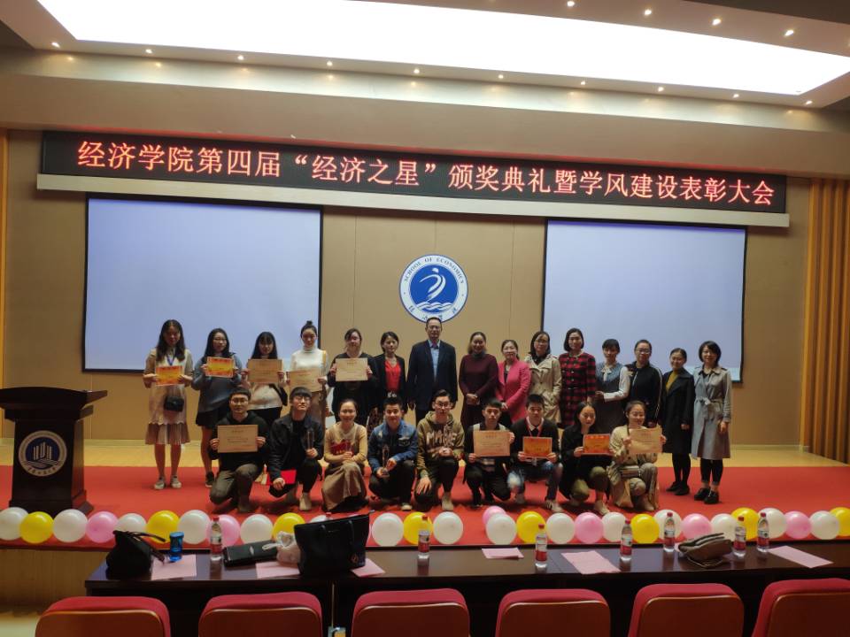 10月12日下午,经济学院第四届 “经济之星”颁奖典礼暨学风建设表彰大会在田家炳209报告厅举行。学院党委书记王小玲、党委副书记于频、学院“巴渝学者”谢新、国贸系主任蒋兴红、贸经系主任杨海丽、会展系主任林黎、经济学系何泱泱、教务办严艳及学团办全体辅导员出席了本次表彰大会。